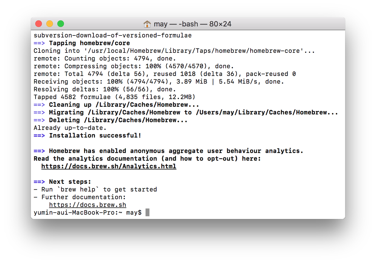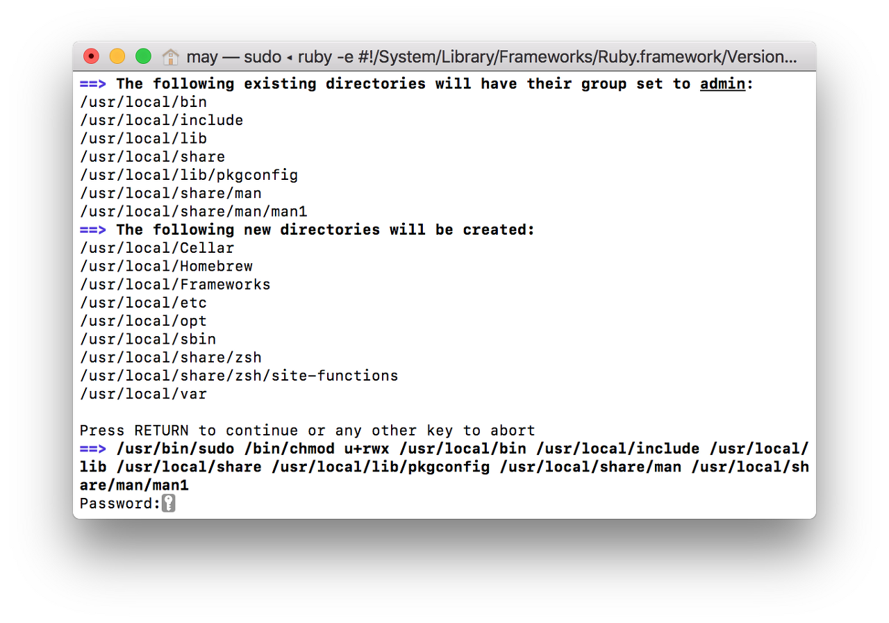 터미널에 /usr/bin/ruby -e "$(curl -fsSL https://raw.githubusercontent.com/Homebrew/install/master/install)"를 입력하고 엔터를 누른다.