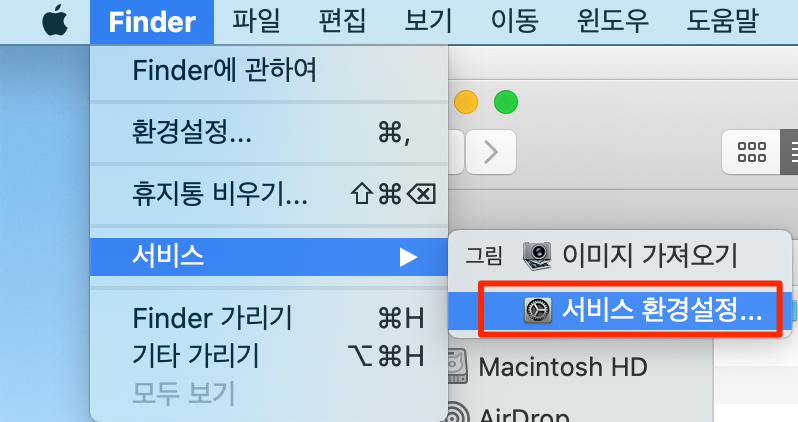 . 파인더에서 터미널을 바로 오픈하기 위해 먼저 Finder > 서비스 > 서비스 환경설정 메뉴로 들어가 주세요