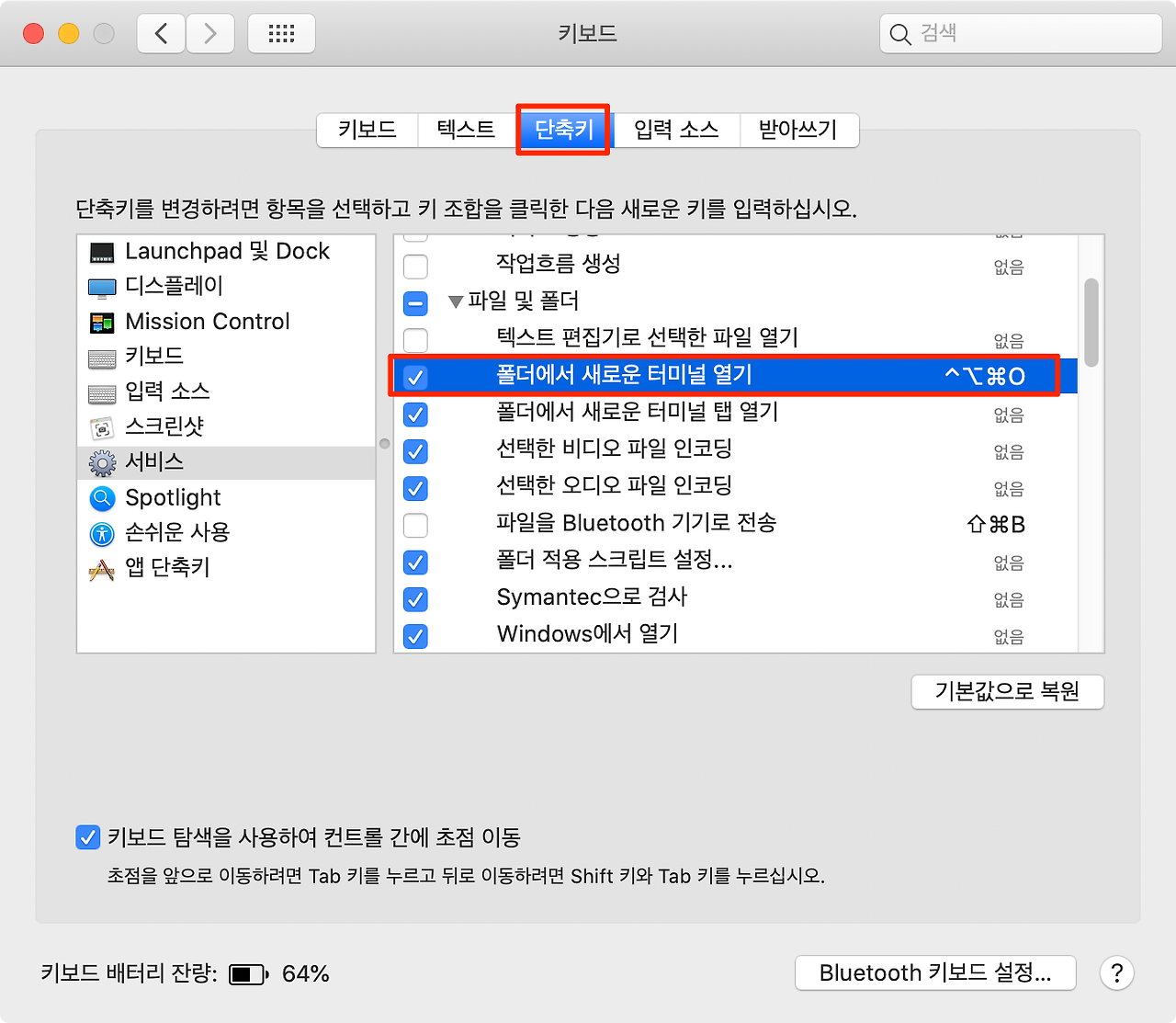 2. 상단에 “단축키” 탭으로 이동하여 서비스 > 폴더에서 새로운 터미널 열기 항목을 활성화 하고 사용할 단축키를 설정해 줍니다. 저는 ⌃⌥⌘+O 로 설정해 주었습니다.
