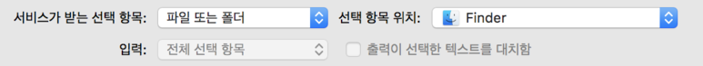 4. "서비스가 받는 선택 항목: 파일 또는 폴더", "선택 항목 위치: Finder"를 선택합니다.