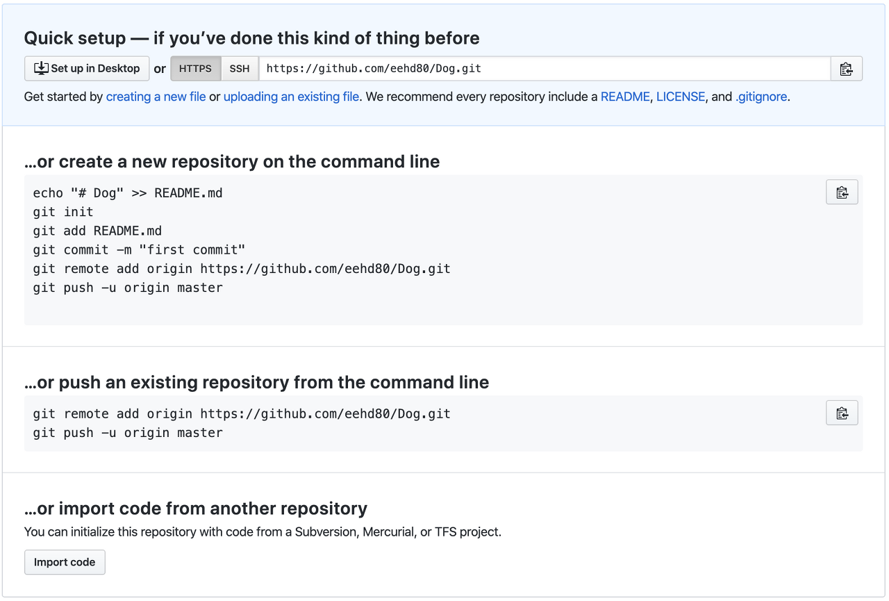 리포지토리 생성 후 아래와 같은 메시지가 나옵니다.