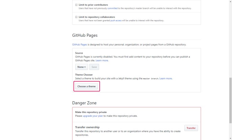 2. 화면을 쭉 내리면 GitHub Pages 섹션이 나옵니다. Choose a theme 클릭합니다.