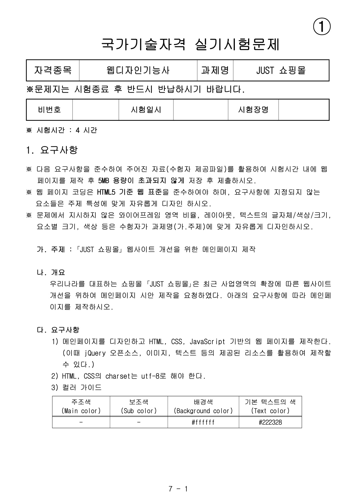 작업 전 프로그램 설치가 필요합니다. 설치를 위해 아래 페이지를 참고하세요. https://oddcode.tistory.com/69?category=836326 웹디자인기능사 설치 프로그램 1. EDIT 프로그램 - Brackets 시험장에 설치되어 있는 Brackets을 사용해 공부해보겠습니다. 아래 사이트에서 Brackets을 설치해주세요. http://brackets.io/ A modern, open source code editor that understands.. oddcode.tistory.com HTML 코딩 시 중요(★★★★★) 체크포인트 웹페이지 코딩은 HTML5 기준 웹 표준을 준수하여야 하며, HTML 유효성검사 (W3C validator)에서 오류(‘ERROR’)가 없도록 코딩하여야..