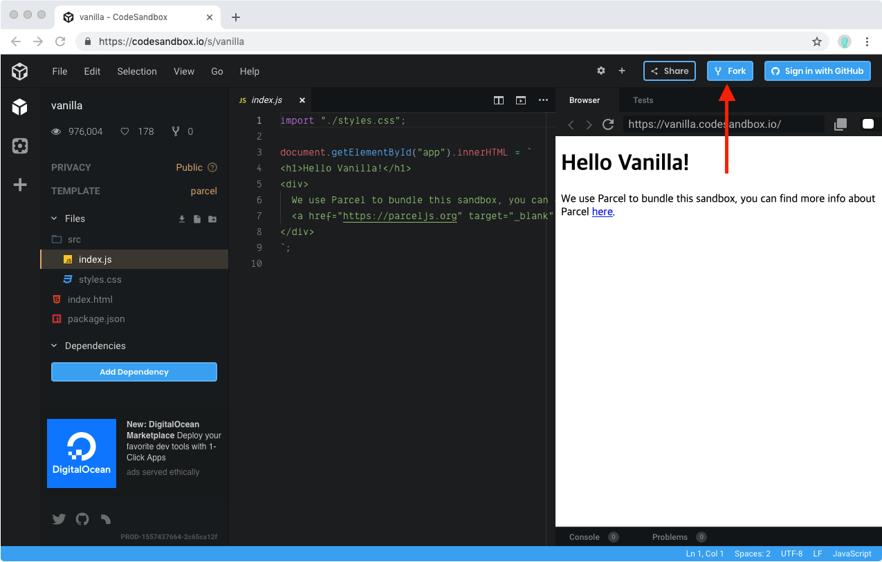 다음과 같은 에디터가 나타날텐데, 상단에 Fork 버튼을 누르세요.