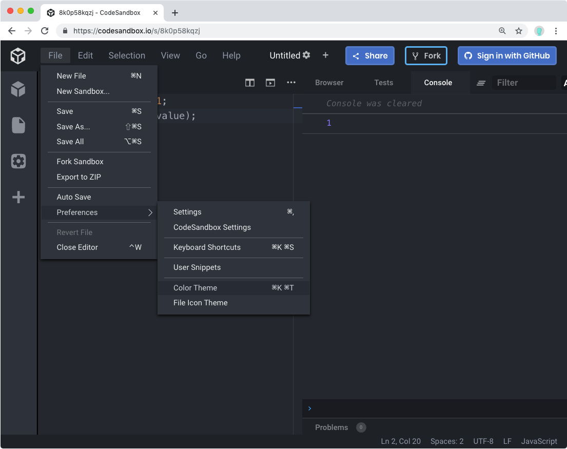 CodeSandbox 에서는 코드 테마도 바꿀 수 있답니다.