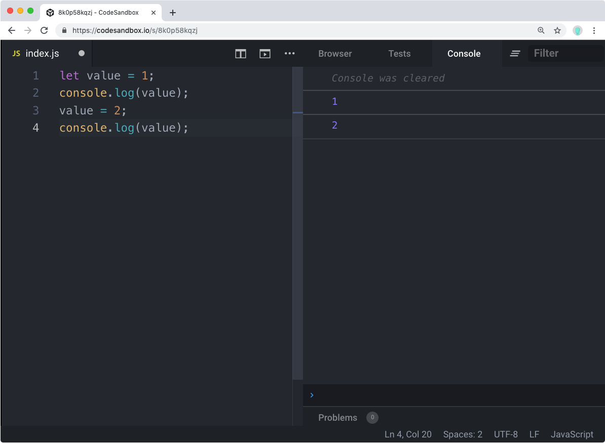 그러면, 앞으로 우리가 value 를 조회하면 value 는 1을 가르키게 됩니다. 예를 들어서 우리가 이전에 배웠던 console.log 를 통하여 value 값을 출력하도록 해보세요.