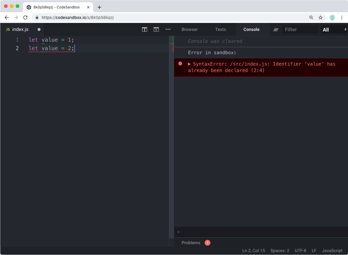 변수를 선언 할 때에는 이렇게 let 이라는 키워드를 사용합니다. 사용 하실 때 주의 할 점은 한번 선언했으면 똑같은 이름으로 선언하지 못합니다.