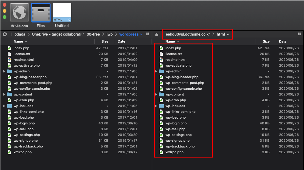 본인 계정에 접속하여 다운 받은 워드프레스 파일을 /html 폴더에 업로드합니다.